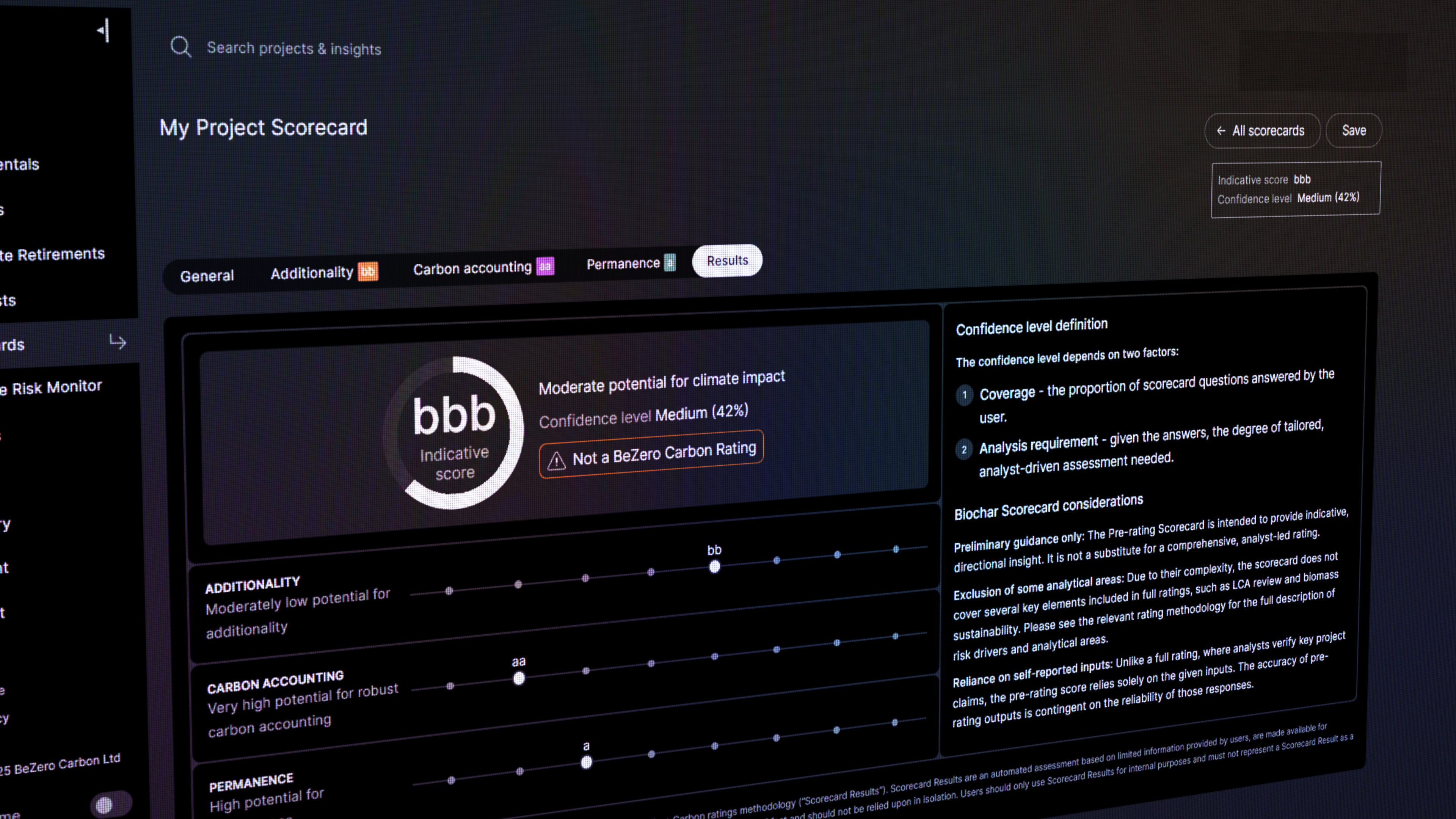 BeZero’s analysis goes beyond headline ratings, giving them access to additional tools and data. The Scorecard, in particular, is a practical way to approximate where a non-rated project might fall on quality metrics and determine whether it merits deeper pursuit.