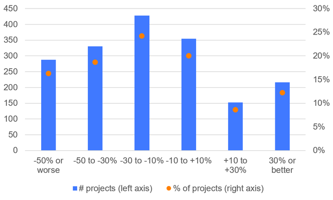 Figure 1. Distribution of projects by historical over and under-delivery (realised issuance versus ex ante forecast issuance). Source: BeZero Carbon Issuance Risk Monitor.