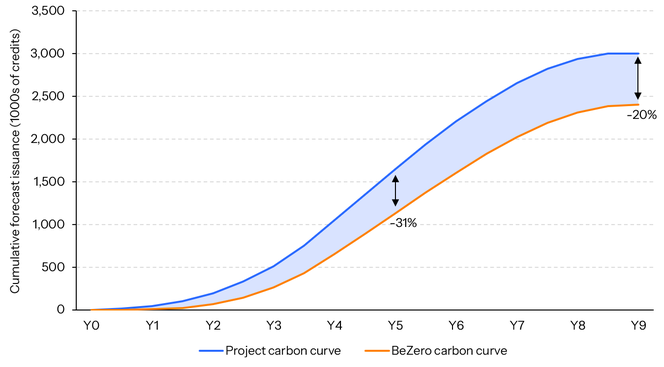 Figure 2. Comparison of carbon curves for an illustrative ARR project. Data source: BeZero Carbon.