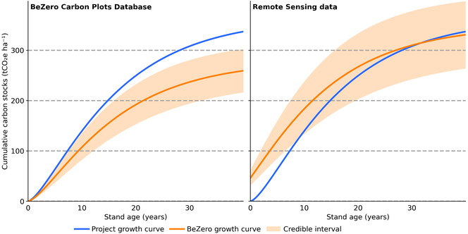 We combine these data with information on forest age to parameterise growth equations, and use spatial stratification to align with environmental conditions and project activities. Our remote sensing scientists, statisticians, and forestry experts evaluate these curves and their respective uncertainties, relative to the project’s own carbon curve assumptions, to inform our view of delivery risk.